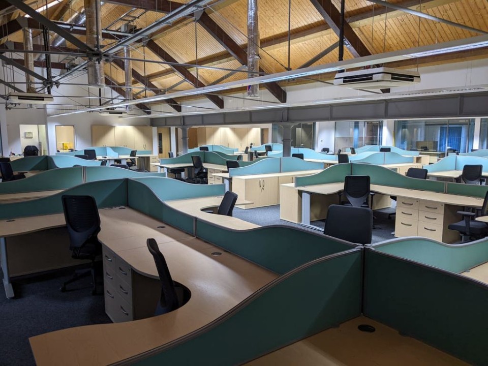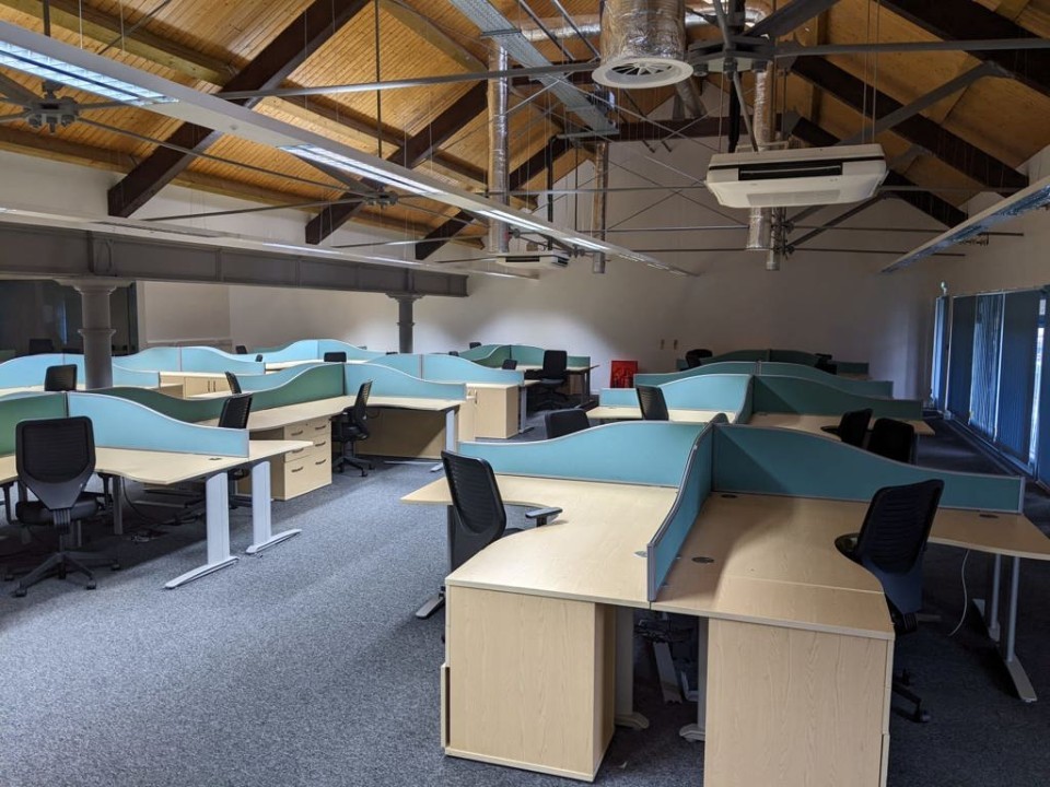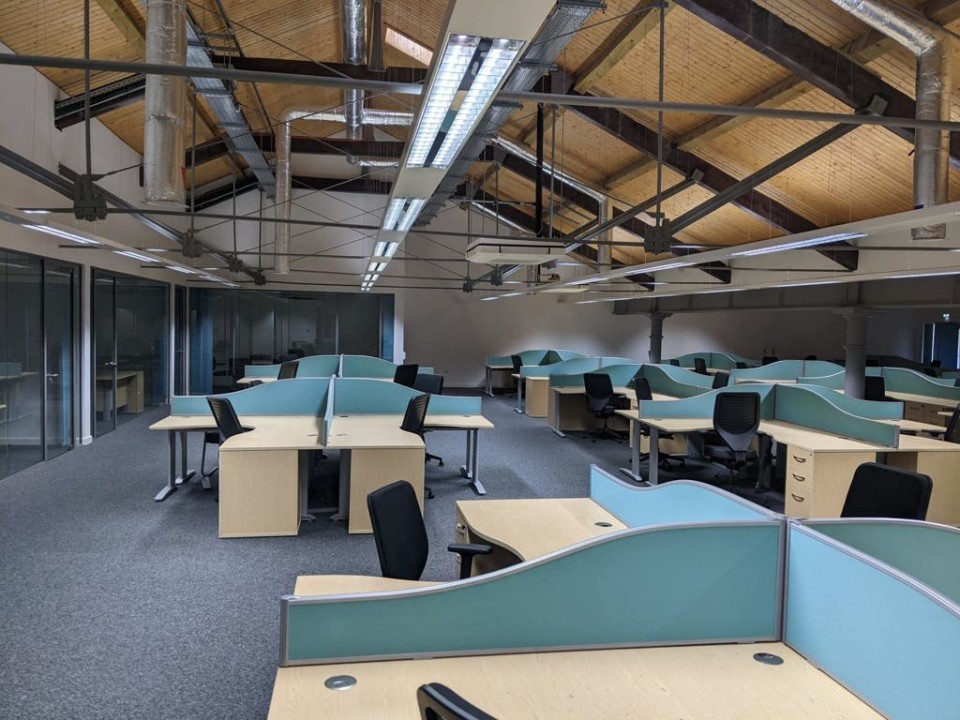 - The unit is on the upper ground floor, fully fitted with glazed frontages and vaulted ceiling, high quality WCs, kitchen area, storage cupboards, air con, perimeter trunking, lighting and carpets already fitted.