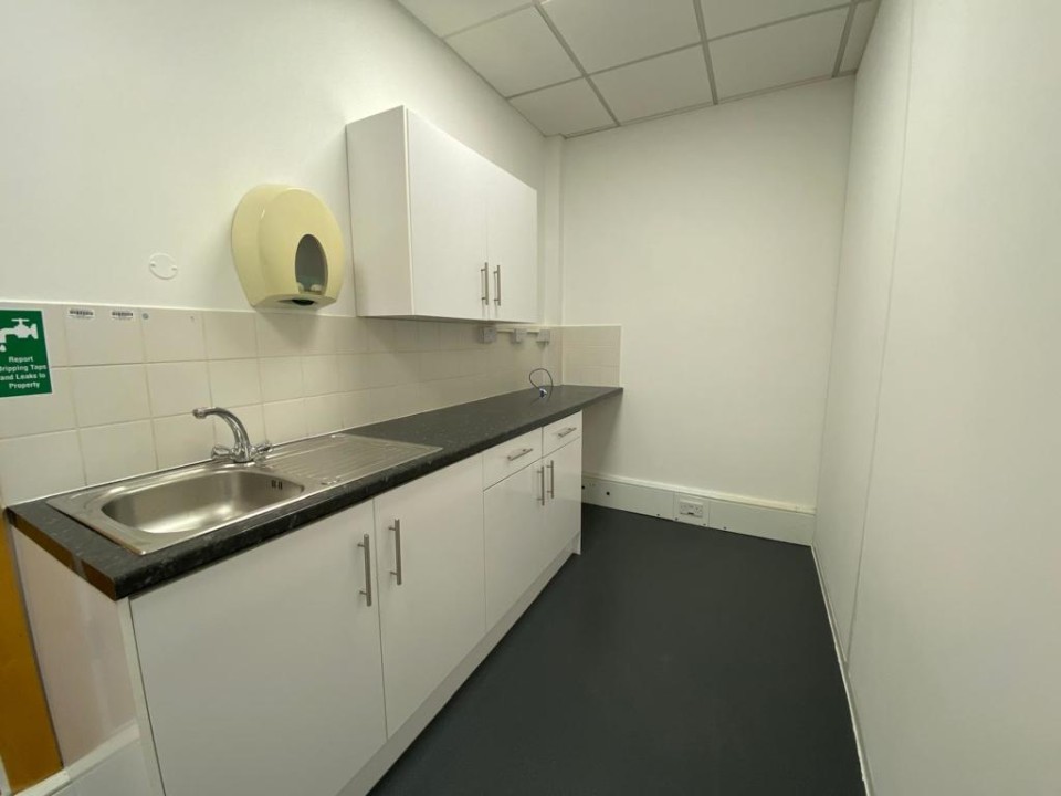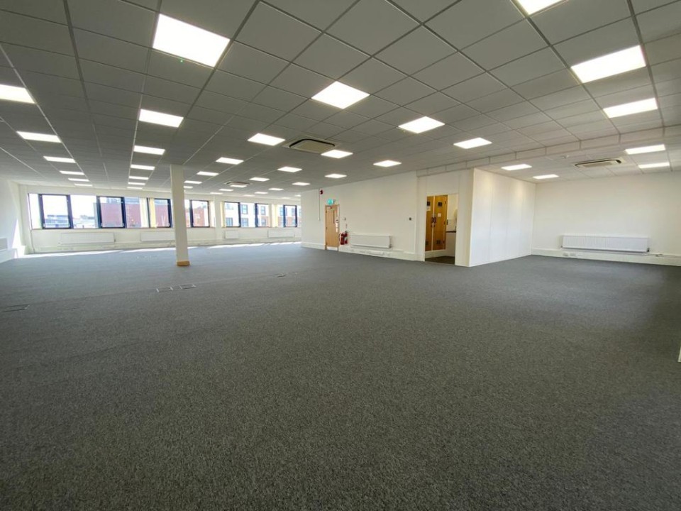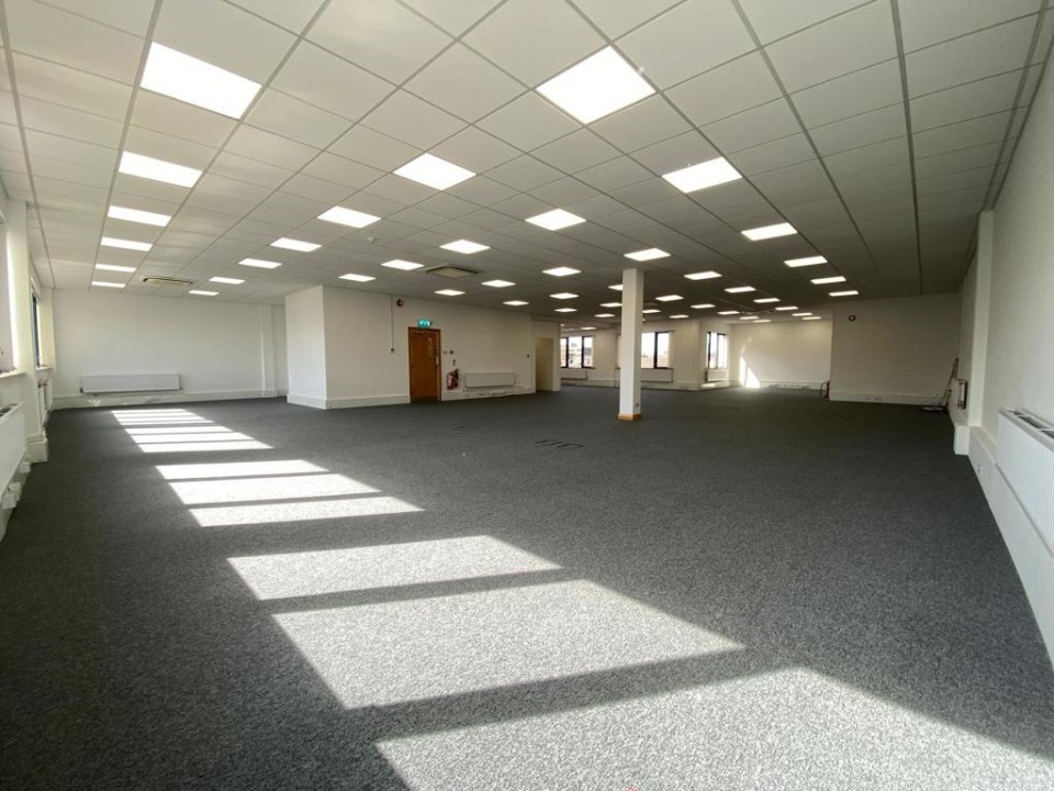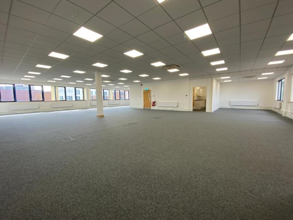 - The office benefits from LED lighting, perimeter trunking with inset CAT 5 data cabling, raised floors with inset power/data boxes, kitchenette, and air-conditioning